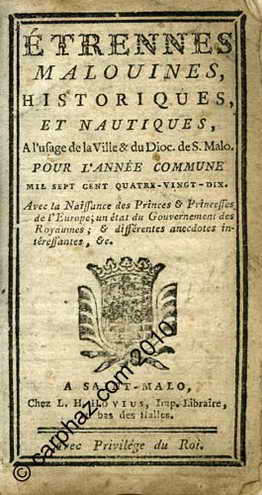 P 769 T 460 | Les Etrennes Malouines - Historiques et Nautiques | Relié | L. H. Hovius | 1790 | |||||||||||||||||||||||||||||