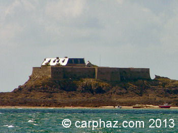 Le fort est construit sur l'ancienne île Saint-Antoine située à environ 3 Km * (1,62 mile marin) au Nord-ouest de Saint-Malo et face à Dinard au milieu des passes du Décollé et des Portes. La légende prétend que l'île d'Harbour aurait été le port primitif d'Alet avant le raz de marée de 709 et que saint Aaron y aurait accueillit l'ermite Mac Low (saint Malo) en la Chapelle Saint-Antoine.En 1689 Siméon Garengeau y fit construire, sur les plans de Vauban, un fort qui comprenait une batterie basse, une batterie haute en fer à cheval, un hangar, un corps de garde pour l'officier, un autre pour les soldats, un magasin à poudre et une chapelle. Une porte bastionnée protégeait son entrée. Il a remplacé la vieille redoute qui était en ruine. En 1697, son armement était composé de 2 canons de 36 livres, 6 canons de 24 livres et 4 canons de 18 livres. Il était dirigé par 2 officiers sous les ordres desquels servaient 4 canonniers de mer, 100 canonniers de milice et 30 soldats. Le roi y entretenait 4 canonniers. L'organisation de la défense du fort de l'île Harbour était, au 1er janvier 1758, assurée par 1 capitaine de navire, 2 lieutenants, 100 canonniers, matelots et manoeuvres, 3 canonniers entretenus par la marine. Son armement était de 2 canons de 36 livres, 8 canons de 24 livres et 8 canons de 18 livres.Le rapport du citoyen Le Blanc daté de l'an 2 de la République détail l'armement du fort de l'île Harbour qui comprend 1 canon de 36 livres, 6 canons de 24 livres et 1 canon de 18 livres, tous en fer, montés sur des affûts de côte et 2 mortiers de 8 pouces également sur leurs affûts. Un canon de 24 livres bat lanse de Saint-Enogat et une partie de la passe du Décollé, 1 mortier de 8 pouces bat l'anse de Saint-Lunaire et l'entrée de la passe du Décollé, 2 canons de 24 livres battent les passes des Portes et l'anse de Cézembre, 1 mortier de 8 pouces bat les 3 passes précédentes ainsi que la chenal de l'entrée de la rade, et croise ses feux avec ceux du Petit Bé et la Conchée. Ce fort est munit d'un four à rougir les boulets et tous les ustensiles à son usage. Le fort est, à cette époque de lan 2 de la république, sous la responsabilité d'un commandant temporaire qui dirige une garnison de 16 canonniers volontaires et 23 hommes d'infanterie qui sont, chaque jour, exercés à la manuvre du canon par un instructeur du 8e régiment d'artillerie. Un gardien à demeure est chargé des munitions d'artillerie. Le citoyen Le Blanc estime qu'en cas de besoin le fort devrait avoir une garnison de 2 officiers, 3 sous-officiers et 46 canonniers indépendamment des 100 hommes d'infanterie pour la défense du fort. Afin d'entretenir le matériel le citoyen Le Blanc préconise que l'on tir au moins 3 coups de mitraille avec chaque pièce d'artillerie. Le fort de l'île Harbour fut, en 1899, armé de canons à tir rapide. D'un côté, il bat la passe du décollé; de l'autre, il croise ses feux avec ceux de Cézembre sur la passe des Portes. Le poids d'un canon de 36 livres était de 3,250 Kg environ, celui d'un canon de 24 livres était de 2,500 Kg environ et celui d'un canon de 12 livres était de 1,450 Kg environ. Un tir, à 100 mètres d'une cible, d'un boulet de 36 livres pénétrait de 1,30 mètre dans un massif de chêne et de 90 cm pour un tir à 600 mètres. Le Fort est inscrit au Patrimoine par un arrêté du 27 septembre 1934. Ensuite, il fut classé Monument Historique par arrêté du 4 juin 1952 et appartient, aujourd'hui, à une société privée. Il est parfois accessible à marée basse, lors des très fortes marées, depuis la plage de Dinard et a, un temps, semble t-il, appartenu à l'acteur Alain Delon. |