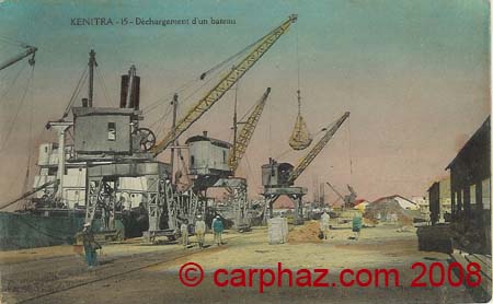 L'Oued Sebou, le plus grand fleuve Marocain se jette dans lAtlantique à trente-deux kilomètres au Nord de Rabat. Son embouchure est dominée par la masse imposante de la casbah de Mehdia, bâtie sur le flanc d'un escarpement rocheux de la rive gauche.Début septembre 1912, l'Omnium dentreprises chargées de lexécution dun contrat de transport pour le compte de ladministration de guerre s'installe à Kénitra. Elle construit un appontement et réunit un important matériel flottant, chalands et remorqueurs de rivière. Durant la même période, l'association des "Transports sur le Sebou" filiale de l'Omnium d' Entreprises passe des contrats daffrètement pour les cargos à faible tirant deau. Ainsi, le 14 novembre 1912, le "Fluor" modeste cargo de 1100 tonnes franchit le premier la barre du Sebou et remonta jusqu'à Kénitra avec un chargement complet de charbon et dapprovisionnements qu'il débarqua sur la berge à peine débroussaillée. Le lendemain, deux autres navires le rejoignaient. Par la suite, une grue de six tonnes fut mise en place sur lappontement et permit le débarquement des locomotives et wagons prévus pour la voie de 0.60 mètre. L' importance de Kénitra devenait réelle, aussi, le Général Lyautey décida que le port ne serait plus, à compter du 1er janvier 1913, réservé aux seuls besoins de l'armée mais également ouvert au commerce. La création du port de Kénitra dans la région Nord du Maroc, était susceptible de concurrencer le port Espagnol de Larache dont une compagnie Allemande entreprenait la construction. Lessor de Kénitra devint prodigieux et le 27 juin 1913 fut institué le contrôle civil.Le 9 novembre 1915, M. Ferras, ingénieur des ponts et chaussées rendait son rapport au service des travaux publics projetant laménagement général du port de Kénitra. Il prévoyait la réalisation immédiate d'une première tranche de travaux comprenant la construction dun quai de deux cent cinquante mètres de long et équipé de trois grues à portiques et de trois magasins de 1000 M2 de surface. En décembre 1916, date de la signature de la convention passée entre le Gouvernement Chérifien et la Société des Ports marocains qui fut chargée de laménagement et de lexploitation du port, est le point de départ d'une période de travail, defforts, de patience et d'investissements qui conduiront à la prospérité. En cette même année 1916, le tonnage global du port était de 40.000 tonnes. Le travail n'a pas manqué et la seule construction des jetées conditionnant l'entrée du Sebou a nécessité le transport et la mise en oeuvre de 3 millions de tonnes denrochements. Ces roches venaient des carrières de Sidi Bou-Knadel et de l' Oued Akreuch. Puis vint la construction de 30 kilomètres de voies ferrées entre Kénitra et Mehdia, celle dune passerelle de 95 mètres de long sur le Bou-Regreg et dun pont en béton armé qui franchit le Sebou, avec 311 mètres de portée. |