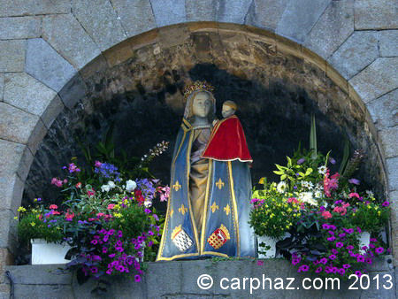 Nichée au dessus de la GrandPorte à Saint-Malo se trouve une statue de la vierge. Nous, Malouins, la nommons Notre-Dame de la GrandPorte; La Miraculeuse Protectrice de la Cité Malouine. Nous sommes au Moyen-âge et un brick de Saint-Malo naviguait vers les Indes merveilleuses. Un beau matin, la vigie sécria à la vue dun volumineux objet flottant à quelques encablures du navire. Cétait une grande caisse cerclée de fer qui fut ramenée par une chaloupe puis, à force defforts, péniblement remontée à bord. Après avoir ouvert la mystérieuse découverte les marins découvrirent que la caisse renfermait une statue de la vierge Marie sculptée dans de la pierre. Comment, autrement que par un miracle, cette lourde masse pouvait-elle rester à flot ? Aussi, le Capitaine du navire décida quà son retour à Saint-Malo il offrirait à la ville cette statue miraculeuse. Voguant vers les Indes, le Capitaine essuya une série de tempêtes et douragans inexpliqués quil crut alors que la Madone ne voulait aller aux Indes et décida de faire virer son brick afin de retourner à Saint-Malo. Là, la vierge miraculeuse fut portée cérémonieusement dans le chur de la Cathédrale Saint-Vincent où, selon la tradition locale populaire, les cloches de la Cathédrales se mirent toutes seules en branle, et sonnèrent à toute volée puis, les fidèles vinrent la vénérer. De là, elle fut placée au dessus de la GrandPorte et une copie y a encore sa place aujourdhui. La légende rapporte que lors de lun des sièges de Saint-Malo par les Anglais, en 1378, un jeune enfant, remarqua que la vierge de la GrandPorte avait baissé sa main, et quelle semblait indiquer avec son doigt un emplacement sur le sol. Les Malouins qui étaient assaillis prêtèrent attention à ce fait et fouillèrent le sol à lendroit montré par la vierge. Ici, ils découvrirent un souterrain creusé par les hommes du duc de Lancastre destiné à envahir la ville. Grâce à lintervention miraculeuse de la vierge, les Malouins purent stopper les mineurs Anglais et sauver leur cité. De plus, le 27 octobre 1661, se déclara, dans Saint-Malo, un effroyable incendie qui ravagea une grande partie des vieilles maisons de bois de la ville. La cité semblait perdue à jamais quant, la tradition rapporte que, la vierge de la GrandPorte se dressa au milieu des flammes et arrêta lincendie. Quoi quil en soit, légende ou réalité, Notre-Dame de la GrandPorte reste vénérée des Malouins et malgré ses nombreuses mutilations elle fut à chaque fois restaurée. La dernière remonte à lannée 2003 et depuis, limposante vierge à lenfant a trouvé place dans la Cathédrale Saint-Vincent. Aussi, maintenant voit-on au-dessus de la GrandPorte une copie de cette statue. Chaque année, le 15 août à l'occasion de la fête de l'Assomption, la vierge de la GrandPorte est, par un certain Philippe bien connu des malouins, revêtue de son manteau bleu, sur lequel se trouve un semé de lys d'or, ce qui symbolise la royauté, et aux parements dorés mais aussi, sont brodés sur le bas du manteau, les armes de Bretagne dun coté et celles de Saint-Malo de lautre. De plus, la vierge est couronnée et lenfant Jésus est revêtu de son manteau rouge aux parements également dorés.